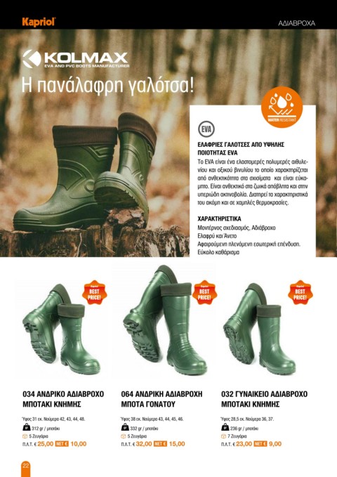 Ύψος 31 εκ. Νούμερα 42, 43, 44, 48. Ύψος 38 εκ. Νούμερα 43, 44, 45, 46. Ύψος 28,5 εκ. Νούμερα 36, 37. Νούμερα 38/39, 40/41, 42/43, 44/45, 46/47. Νούμερα 30,33,35. Μπλε και Πορτοκαλί Νούμερα 30,33,35. Μπλε και Πορτοκαλί