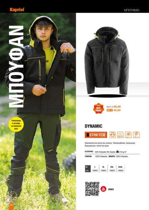 Ελαστικότητα και άνεση στις κινήσεις. Υδατοαπωθητικό. Αντιανεμικό. Ελαφρύ και ζεστό. Ελαστικότητα και άνεση. Αδιάβροχο. Αντιανεμικό. Θερμόνωση. Αντοχή στο κρύo. Υδατοαπωθητικό.